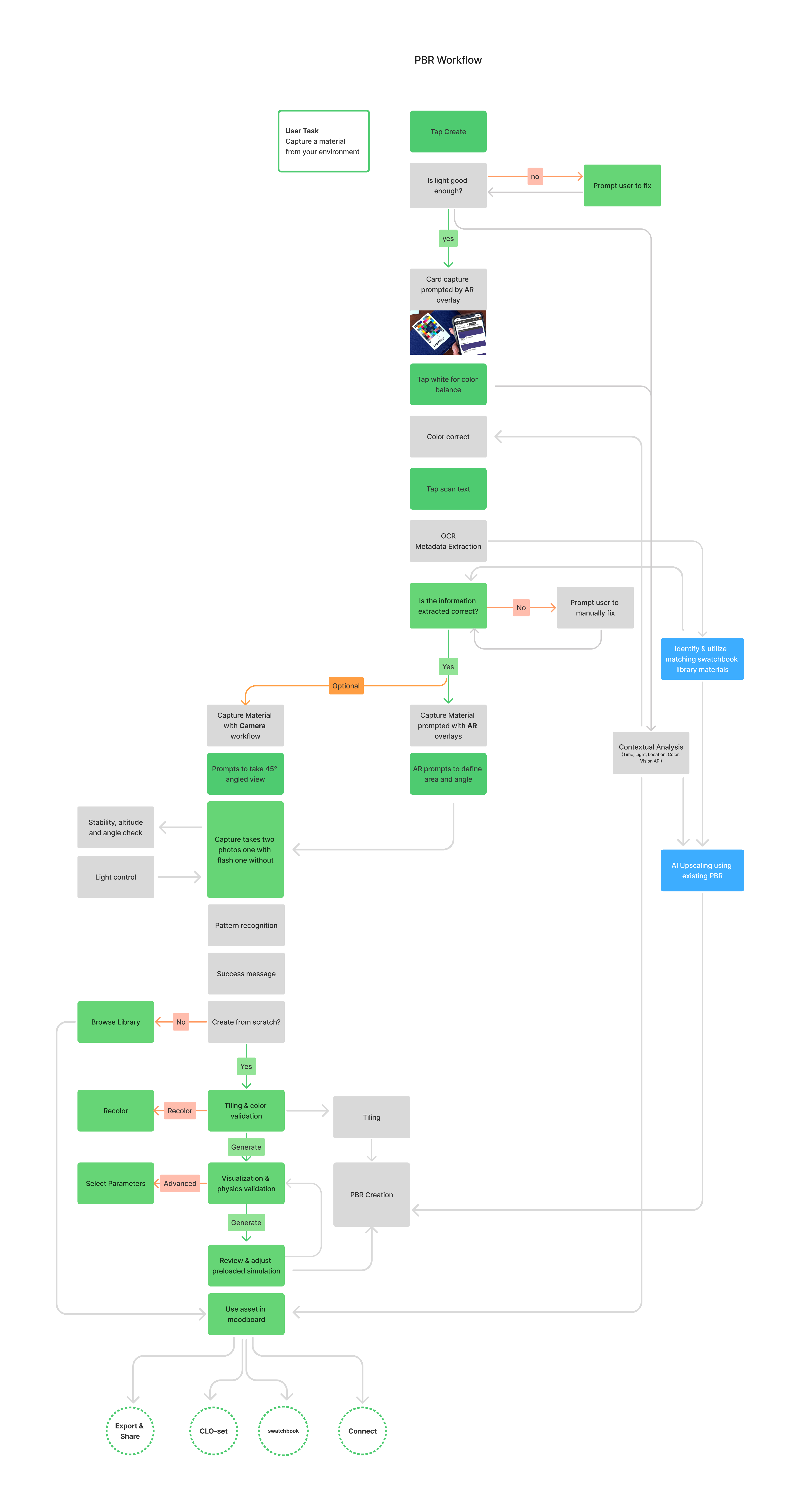 The exploration focused on designing a reliable capture workflow that combines sensor guidance, AI-assisted tagging, and material analysis while keeping the experience intuitive for designers and material librarians.